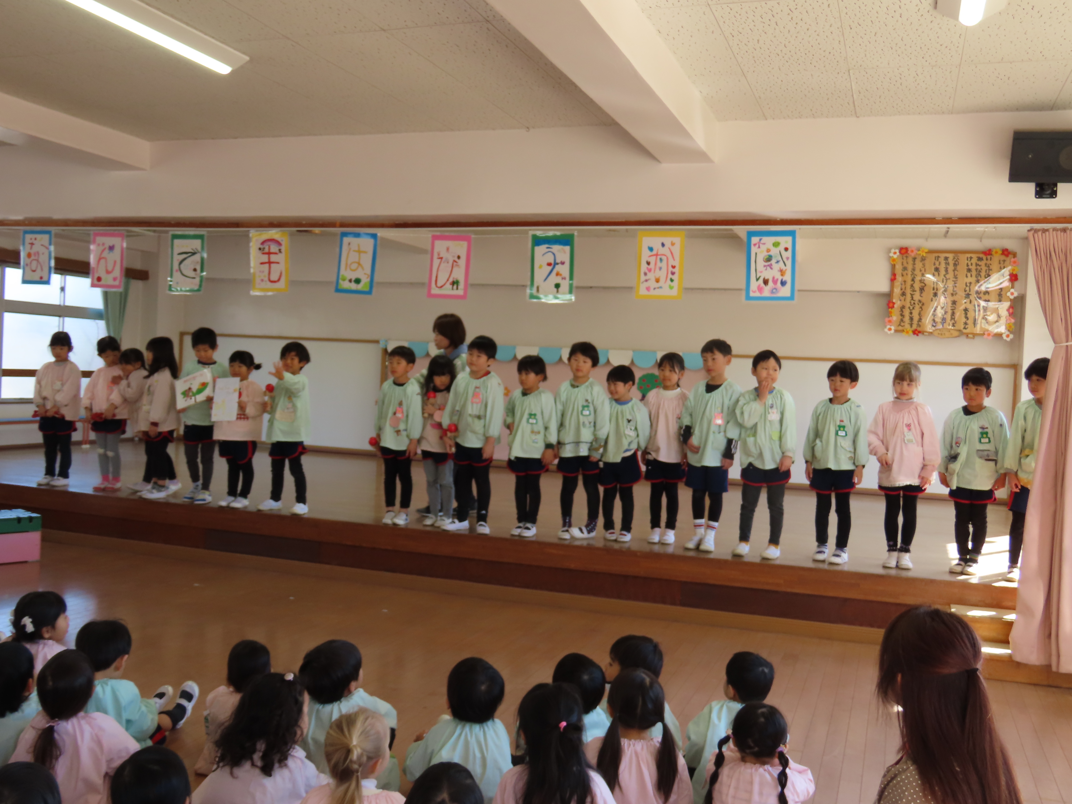 小学校の大きな舞台の上で、おじいさんやおばあさんに歌を聞いていただいたり、一緒に手遊びをしたり、「マツケンサンバ」も一緒に踊ってもらいました。