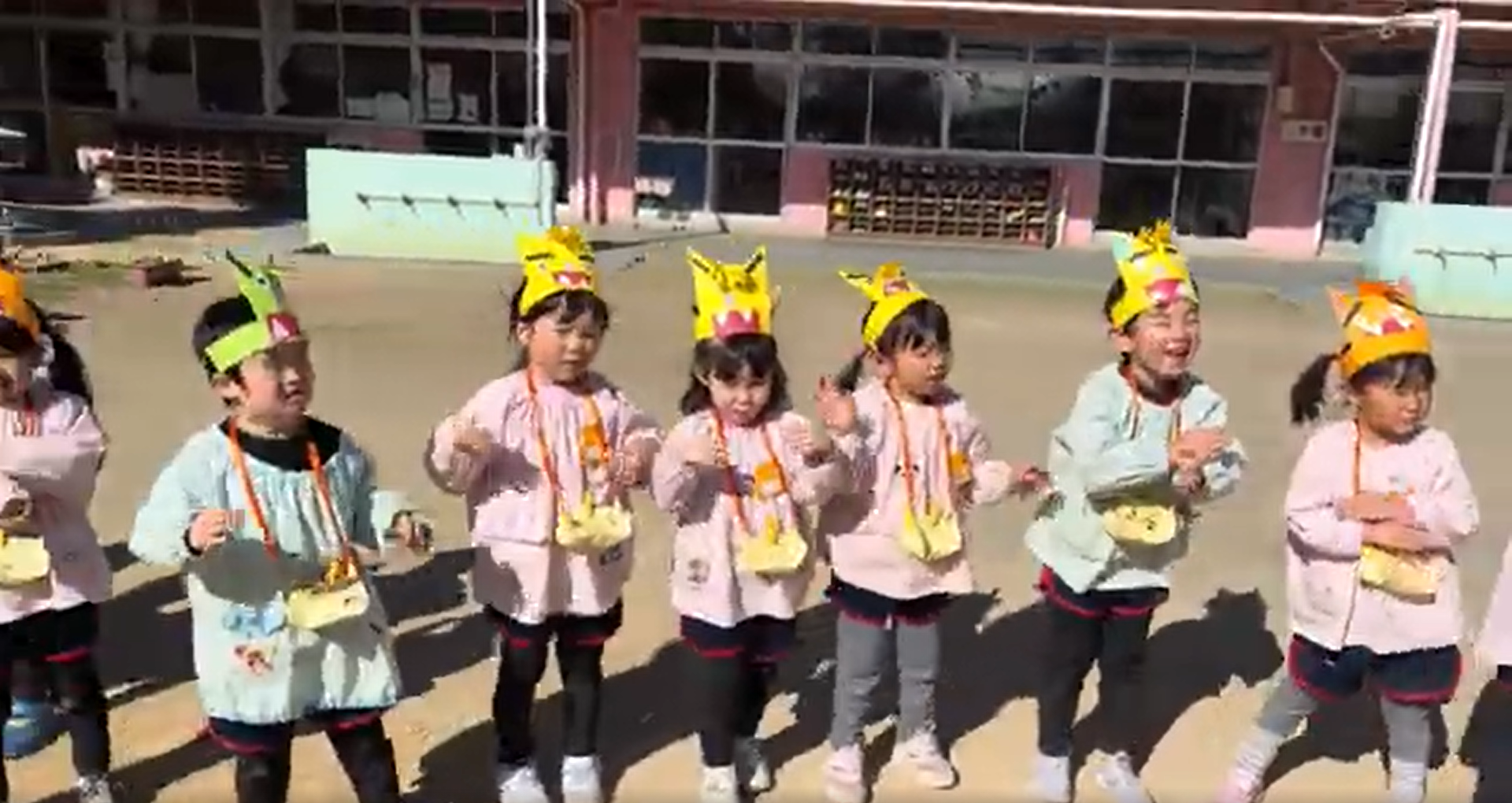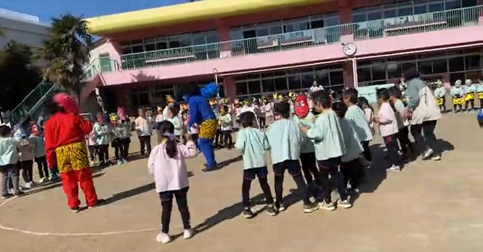 放送で園長先生による節分の話を聞いた後、みんなでお面とマスを身に着けて園庭に集合。